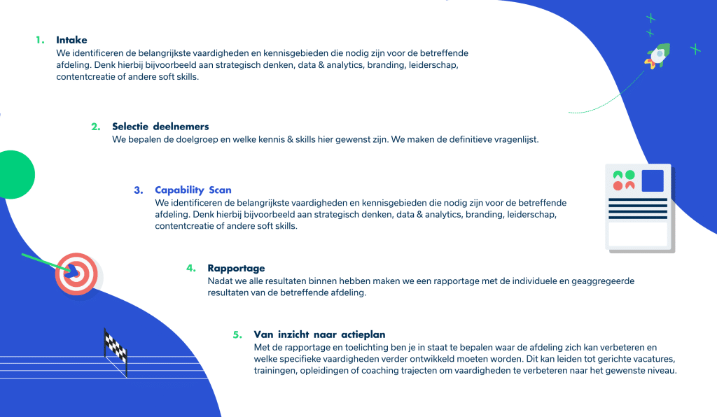 Wil je weten hoe een Capability Scan traject er in de praktijk aan toe gaat? We nemen je mee in het proces wat jij gaat doormaken van intake, tot een inzicht naar actieplan.