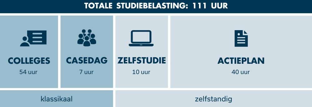 De totale studiebelasting schatten we in op 111 uur. Je bent de hele opleiding bezig met je actieplan, maar het zwaartepunt ligt aan het einde. Daarom zit er altijd een aantal weken tussen het laatste college en het eindgesprek. Je wordt hierin gecoacht door de kerndocent.